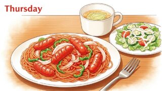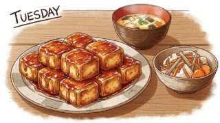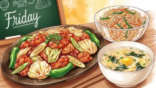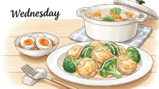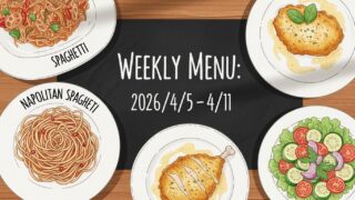 土曜日は一週間の集大成。冷蔵庫に残ったキャベツ、長ネギ、豚こま、卵、天かすなど、すべての食材を使い切る「在庫ゼロ」を目指す献立です。大人3人が大満足できる厚焼きのお好み焼きで、達成感とともに一週間を締めくくりましょう。