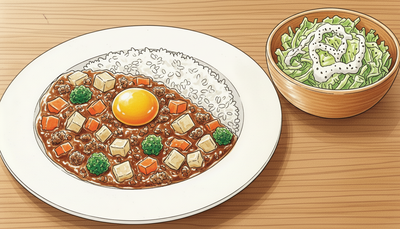 カレーに野菜をたっぷり入れているため、汁物はなしで構成します。その分、カレーの具材を多めにし、満足感を高めています。