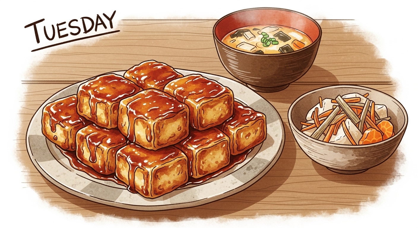 - 強火でタレを煮詰め、厚揚げにしっかり絡んだら完成。
