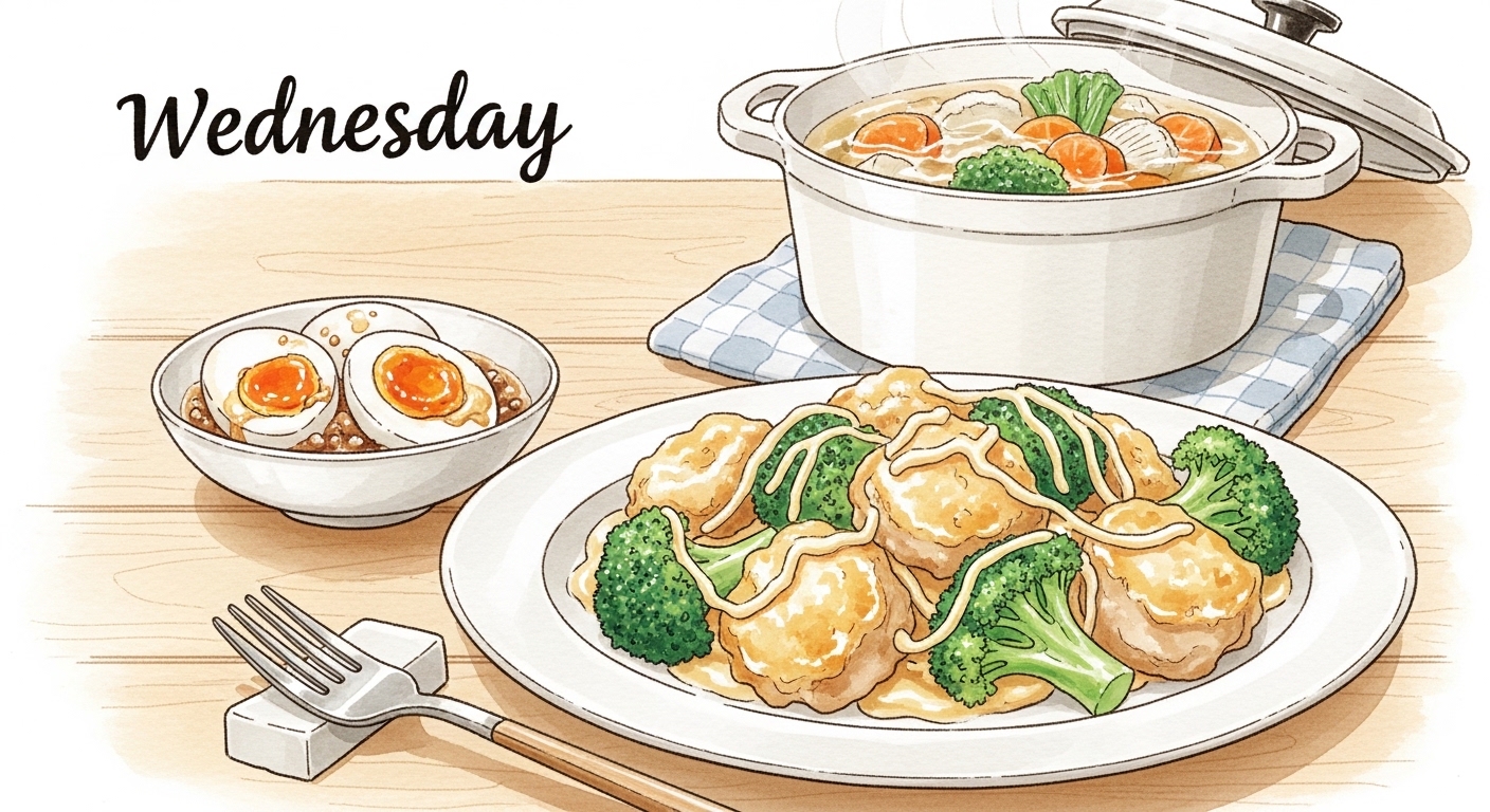 水曜日は、週の折り返し。疲れが出始める頃なので、調理は簡単に、でも栄養バランスは崩さずに、大人3人が満足できるボリュームを確保します。